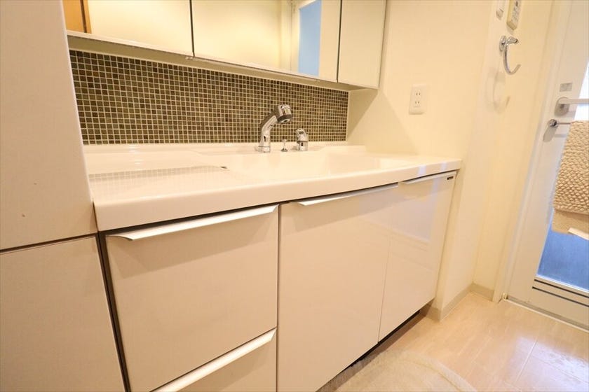 ↑収納付きのワイドな洗面台で使いやすさ抜群♪